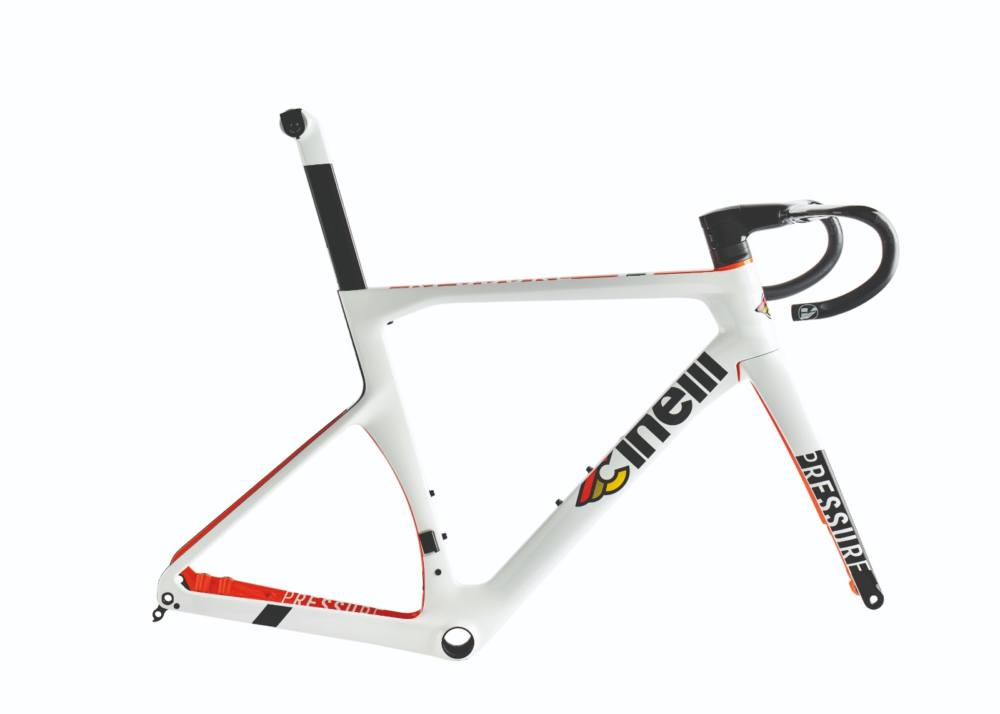 PRESSURE: Il top di gamma monoscocca carbonio ad alto modulo T800 della famiglia racing Cinelli con un sistema completamente integrato. Lo speciale tubo sella aero, il manubrio integrato grafica custom Cinelli FSA Vision Metron 5D ACR, con cockpit e forcella integrati e il passaggio cavi totalmente interno, descrivono una geometria racing imbattibile che fende l’aria. Votato al cambio elettronico, sfoggia freno a disco e perno passante su un carro dai posteriori verticali bassi, per la massima aerodinamicità e una maggiore rigidezza complessiva del telaio: reattività e massimo controllo.