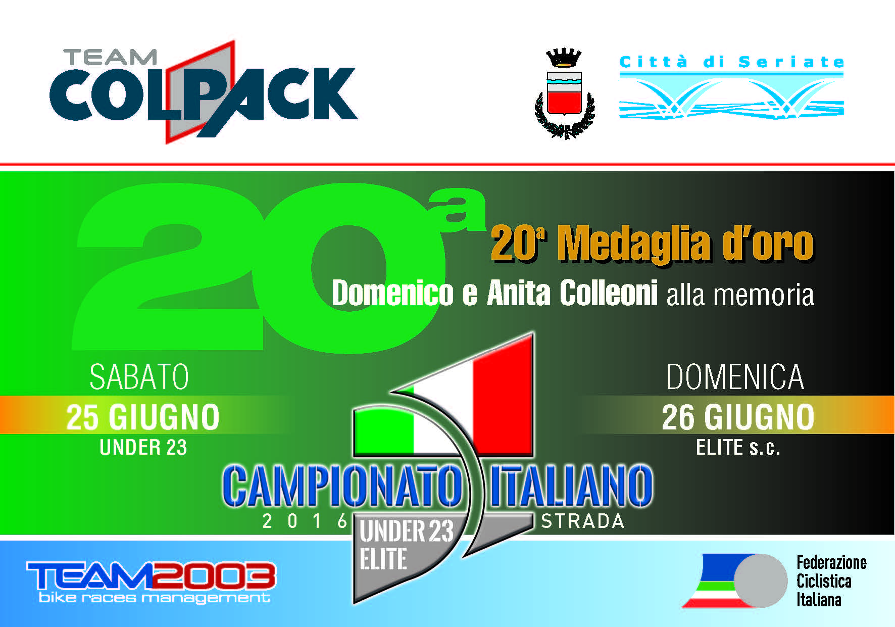 Il presidente Beppe Colleoni, per festeggiare il 25° anniversario della nascita della ditta Colpack, ha voluto un evento speciale e la Federazione Ciclistica Italiana ha accolto la candidatura del Team Colpack per l’organizzazione del Tricolore 2016 riservato alle categorie Under 23 ed Elite senza contratto.