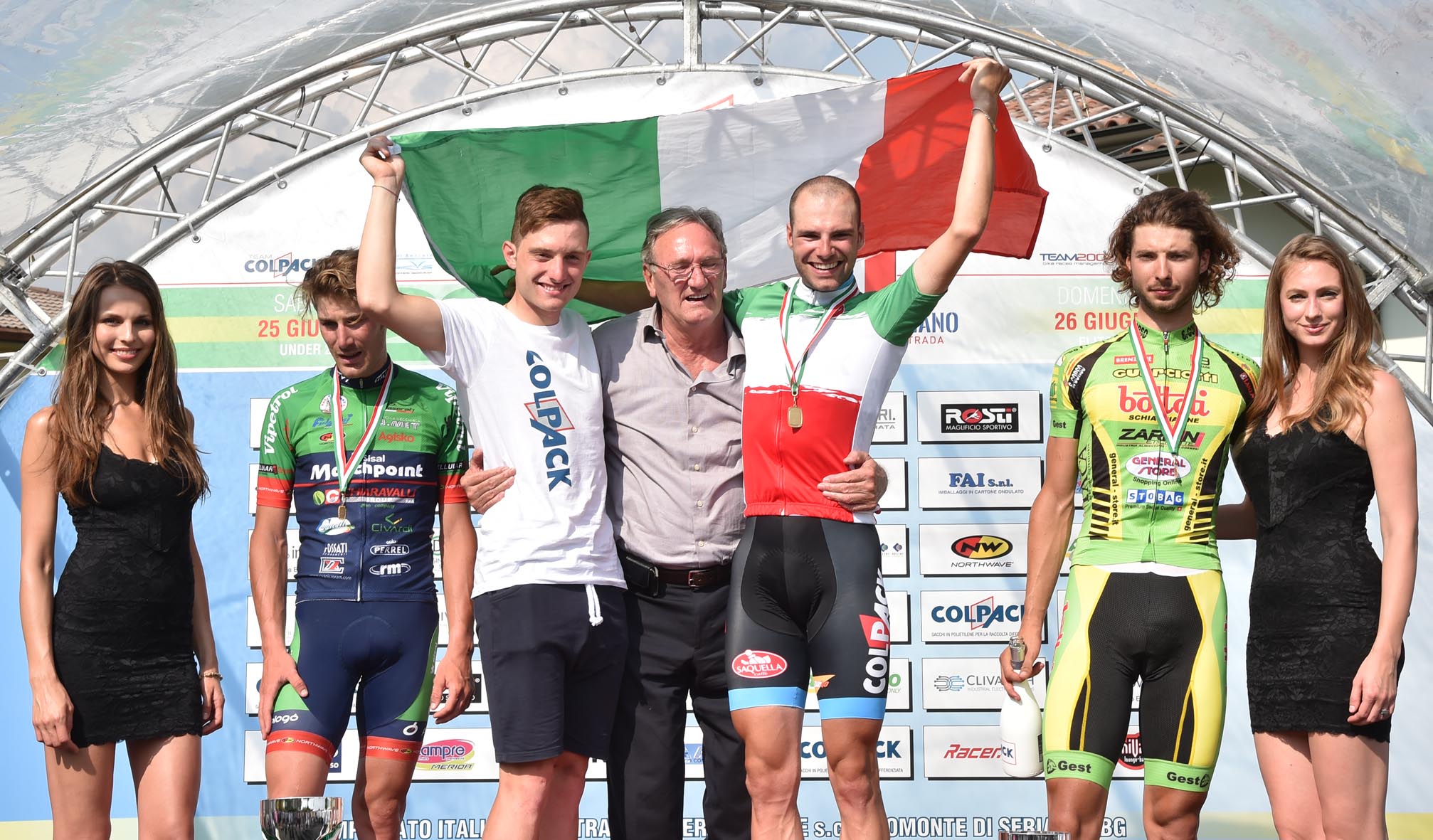 Attaccano poi in tre, mentre alle loro spalle il gruppo torna completamente compatto. Ma diventano subito dieci a condurre quando al traguardo mancano tre giri. Si tratta di Simone Viero e Fausto Masnada (Team Colpack), Damiano Cima e Alfio Locatelli (Viris Maserati), Matteo Grassi (Team Palazzago), Giacomo Gallio (General Store), Gianluca Milani (Zalf-Fior), Roberto Giacobazzi (C.T. Friuli), Luca Ferrario (Equipe Exploit) e Michael Delle Foglie (Gragnano). Al penultimo passaggio in salita rientrano altri corridori, diventano in sedici, e proprio uno degli ultimi arrivati, Raffaello Bonusi (Viris Maserati) scollina per primo. Ma è in discesa che si decide la corsa: allungano in due: Davide Orrico (Colpack) e Matteo Grassi (Palazzago). Li inseguono Masnada, Bonusi, Gallio, Locatelli, Giacobazzi, Delle Foglie, Brovelli e Martinelli. Più indietro Garosio e Ferrario. Al suono della campana la coppia al comando vanta 21” di vantaggio sui più immediati inseguitori. Sull’ultima salita Davide Orrico compie il suo capolavoro. Stacca l’avversario e guadagna sempre più terreno, fino a 1’40”. Poi si lancia in picchiata verso il traguardo dove va a coronare una giornata meravigliosa per lui e storica per il Team Colpac. Un sigillo tricolore coronato alla fine anche con la richiesta di matrimonio fatta alla sua fidanzata Nadia.