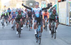 (Gomez a braccia alzate sul traguardo del GP Primavera. Foto Rodella)