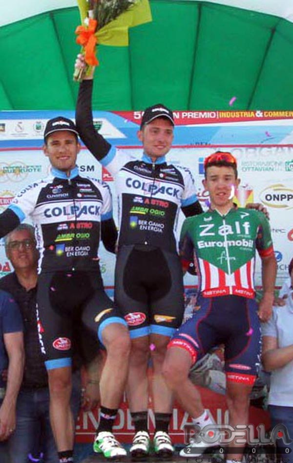 Infatti il 56° Gran Premio Industria e Commercio Città di San Vendemiano si è deciso con uno sprint ristretto tra un gruppetto di fuggitivi con i due Colpack che hanno fatto la parte del leone, lasciandosi alle spalle gli zalfini Bagioli e Rocchetti (nella foto Rodella la vittoria di Consonni).