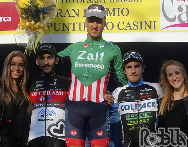 Dietro, degli ex compagni di fuga restano solamente Zilio e Rumsas, sui quali rientrano altri corridori. Serie di scatti e controscatti per le posizioni del podio. Bella l’azione di Lizde che all’ultimo chilometro in salita stacca a sua volta tutti quanti e va a prendersi la piazza d’onore. L’apoteosi arriva poco dopo con il terzo posto ottenuto da Federico Sartor. Settimo Andrea Toniatti e decimo Umberto Orsini.